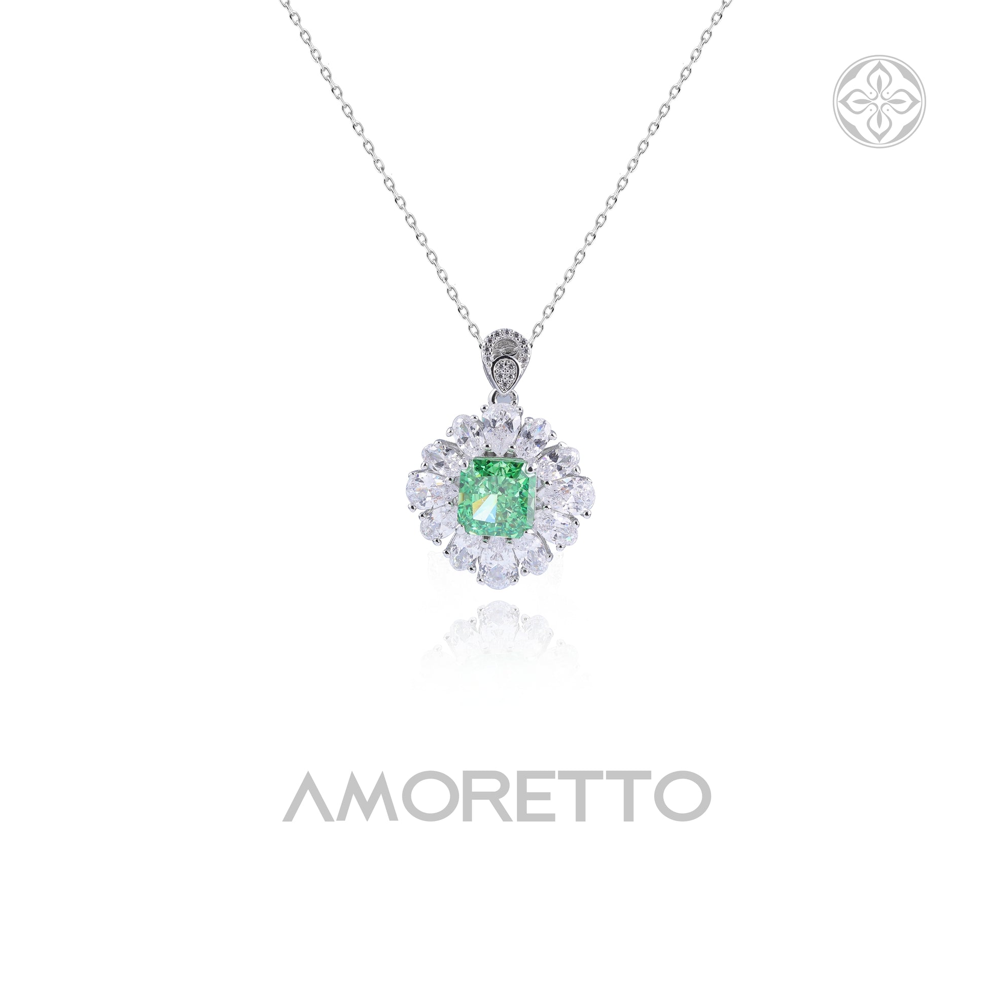 A luminous floral pendant featuring a vivid tsavorite-colored cubic zirconia at the center, framed by a handcrafted halo of marquise-cut cubic zirconia.